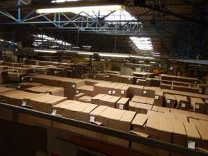 Voici deux photos de cette visite illustrant : i) la production d’une journée de plaques refoulées qui sèchent avant la reprise sur les combinés et autres machines de transformation, et ii) un des nombreux racks de stockage des formes de découpe.