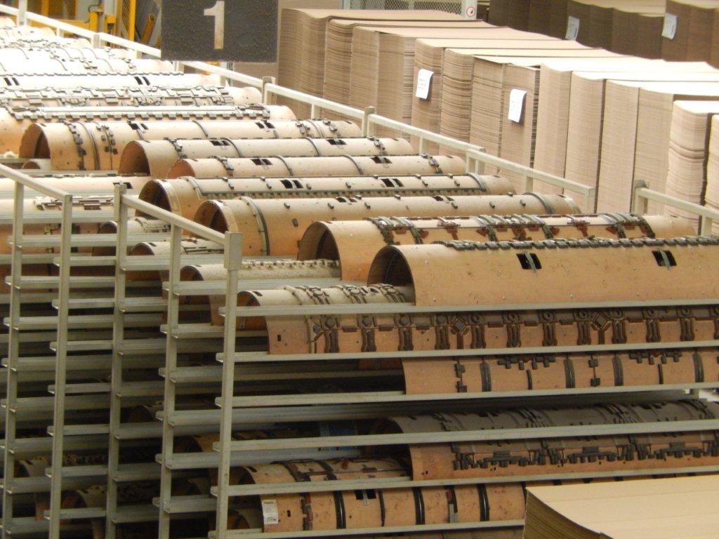 Voici deux photos de cette visite illustrant : i) la production d’une journée de plaques refoulées qui sèchent avant la reprise sur les combinés et autres machines de transformation, et ii) un des nombreux racks de stockage des formes de découpe.