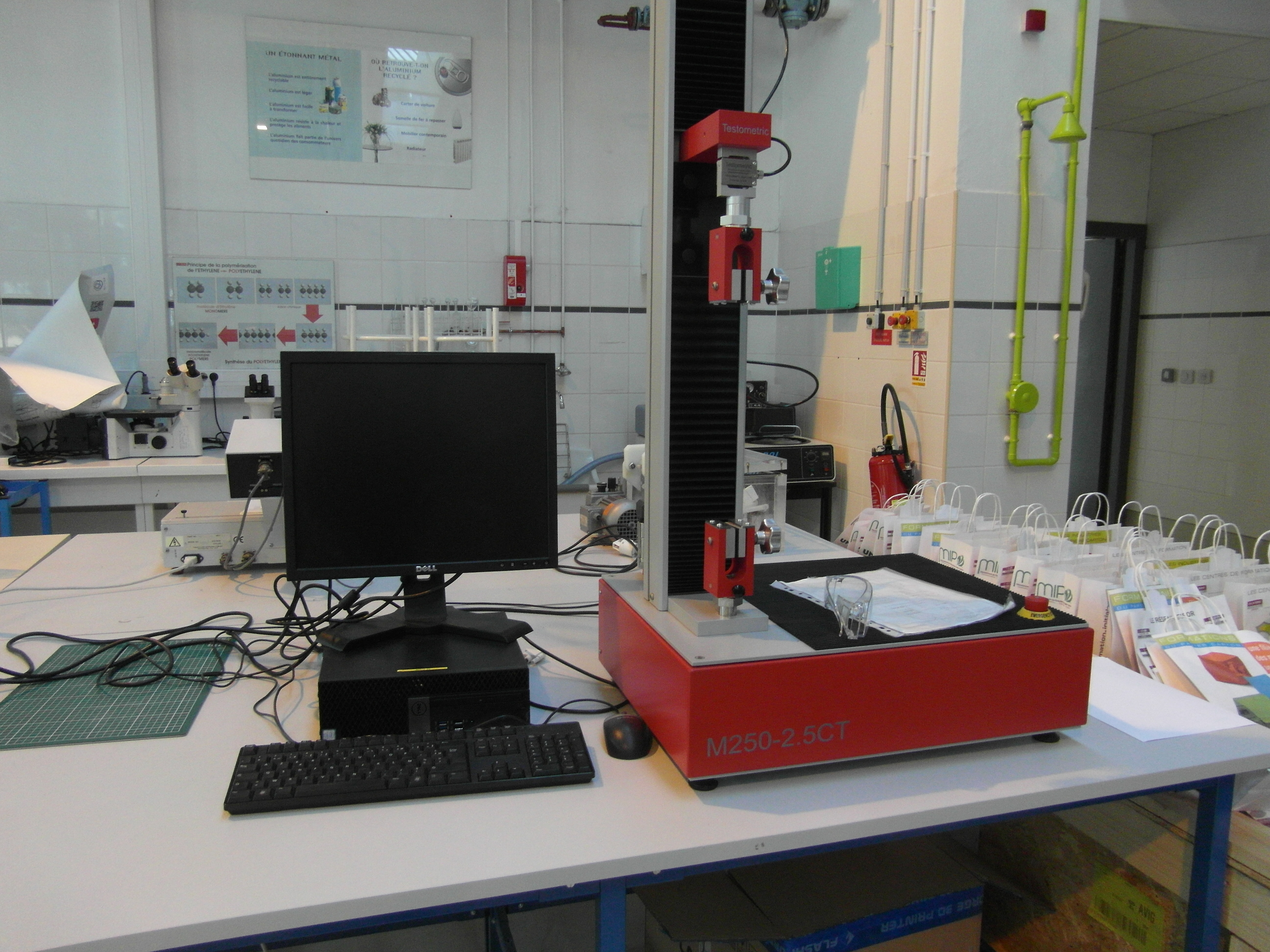Le département PEC a investi cette année dans une machine d’essais universelle de type monocolonne, de façon à diversifier ses possibilités de tests et à assouplir l’utilisation des machines déjà disponibles (utilisation parallèle dans différentes séries de TP, voire en projets tutorés). Jusqu’à présent, deux machines permettaient d’effectuer des tests de traction sur des éprouvettes de polymère, papier-carton et métal ainsi que des essais de compression sur emballages vides (caisses, bouteilles, canettes etc.) et des essais de flexion.