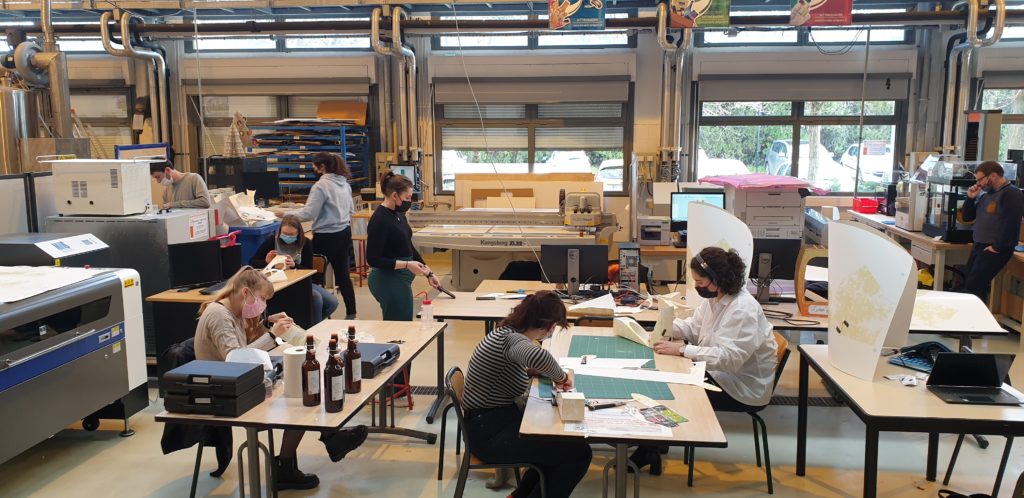 Les étudiants de deuxième année réalisent la fabrication du packaging bière  avec les machines d’impression et de découpe présentes dans la halle PEC à la demande de l’Université.