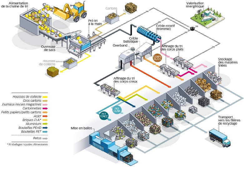 Après une explication détaillée du fonctionnement d’un centre de tri, la problématique environnementale de l’emballage et l’extension des consignes de tri ont été abordées en échangeant avec des professionnels du tri sélectif. Le tri sélectif est une étape cruciale rendant possible le recyclage de certains matériaux d’emballage (plastique des bouteilles d’eau minérale, complexe des briques de lait, acier et aluminium des canettes, …).